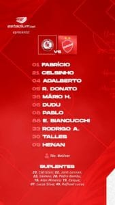 Fabrício; Celsinho, Adalberto, R. Donato, Mário H.; Dudu, Pablo, E. Biancucchi; Rodrigo Alves, Talles e Henan.