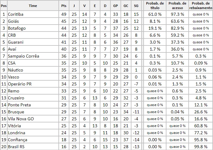 Com isso, a reportagem mostra na íntegra a tabela atualizada com a probabilidade atualizada de cada clube na Série B. Principalmente, a chance de cada equipe na competição nacional.
