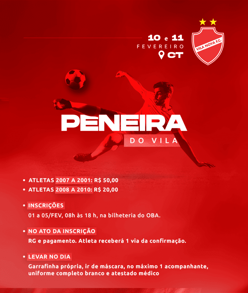 O Vila Nova anunciou mais uma peneira para captar atletas, ocorrerá nos dias 10 e 11 de fevereiro. Os atletas nascidos de 2007 até 2001 pagam 50 reais, os atletas nascidos de 2008 até 2010, vão pagar 20 reais.