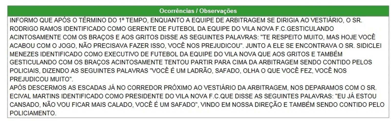 Súmula de Vila Nova x Atlético-GO relata ofensas de dirigentes colorados; veja na íntegra
