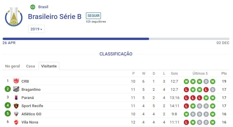 De acordo com o levantamento feito pelo site “sofascore”, o Vila Nova é o sexto time com a melhor campanha de visitante na Série B do Brasileirão. O Tigrão perde apenas para o Atlético-GO, Sport Recife, Paraná, Bragantino e CRB, na sequência. Confira abaixo, o ranking divulgado pelo site.