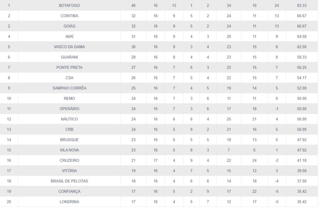 Na parte de cima da tabela, por exemplo, o Botafogo, o Coritiba, o Goiás e também o Avaí, aparecem na parte de cima como as melhores campanhas atuando em seus respectivos domínios na Série B do Campeonato Brasileiro.
