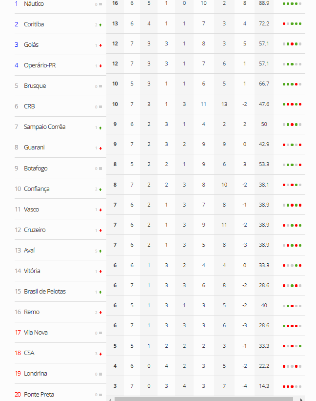 Já o Brasil de Pelotas também ficou no empate em 1 a 1 com a Ponte Preta nesta rodada de sexta-feira. Por fim, o Coritiba bate o Guarani por 2 a 0, no estádio Brinco de Ouro, na cidade de Campinas-SP.