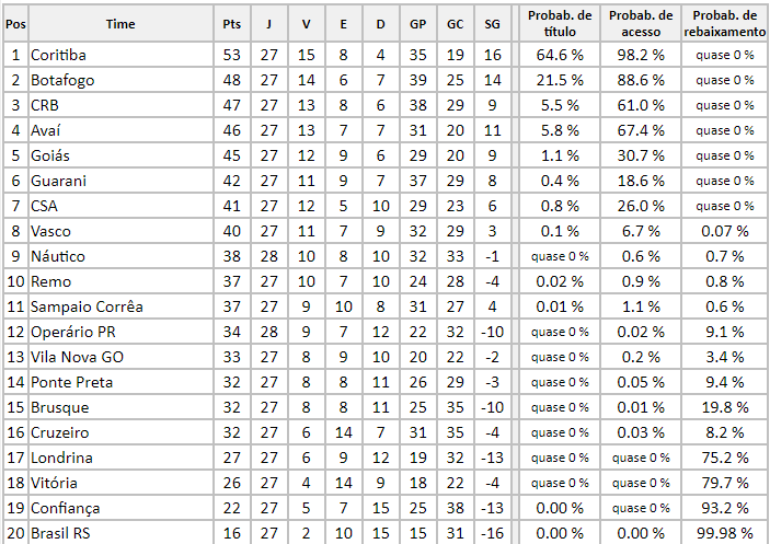 Neste final de semana, a 28ª rodada da Série B do Campeonato Brasileiro ganhou sequência e teve novidades com relação a probabilidade de cada equipe que está brigando por algo na competição. Diante disto, o site chancedegol mostra quais são as chances de cada equipe na competição nacional.