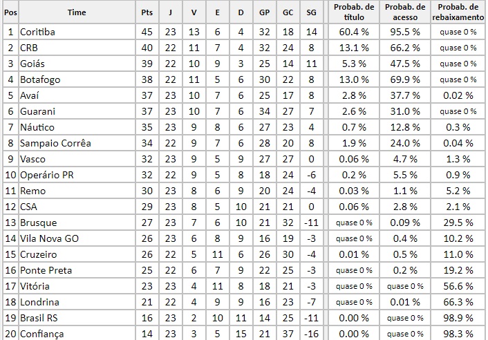 Depois do término da 23ª rodada da Série B do Campeonato Brasileiro, o site chance de gol atualizou as chances de cada time que estão brigando pelo título, acesso e também para escapar das últimas colocações na competição. No entanto, cada time teve a sua probabilidade atualizada.