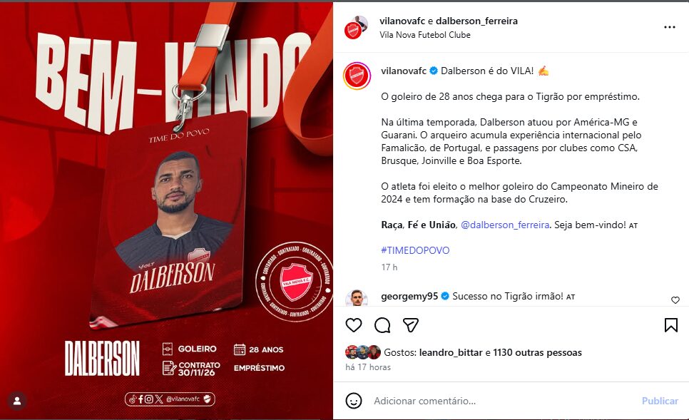O Vila Nova comunicou que iria realizar a contratação do goleiro Dalberson, porém existia a expectativa que o jogador chegasse em definitivo para a temporada 2026, agora a informação é que o jogador assina por empréstimo até o final de 2026.