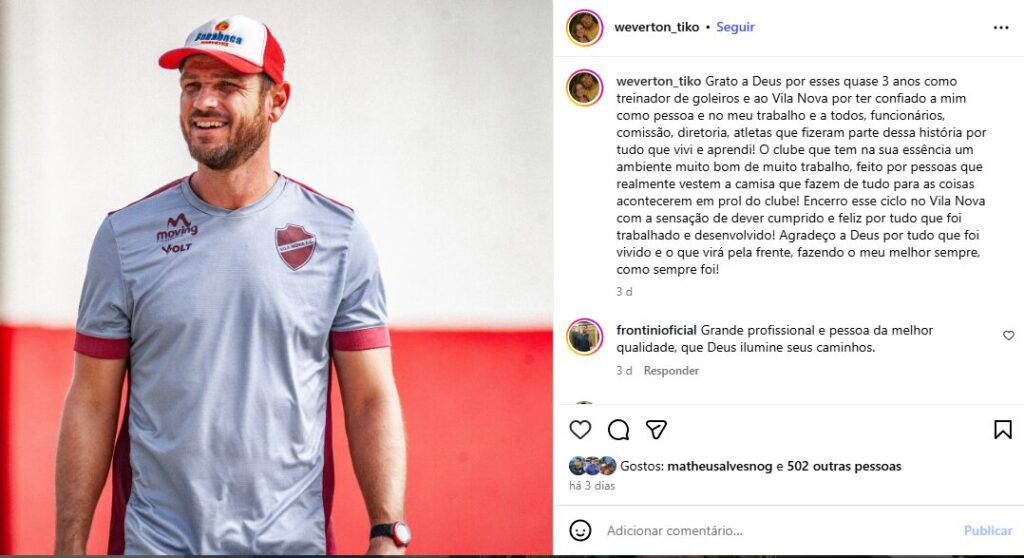 Vila Nova tem uma perda em sua comissão técnica permanente, o treinador de goleiro, Weverton Tiko se despediu de maneira oficial do time e deixou uma mensagem de agradecimento.